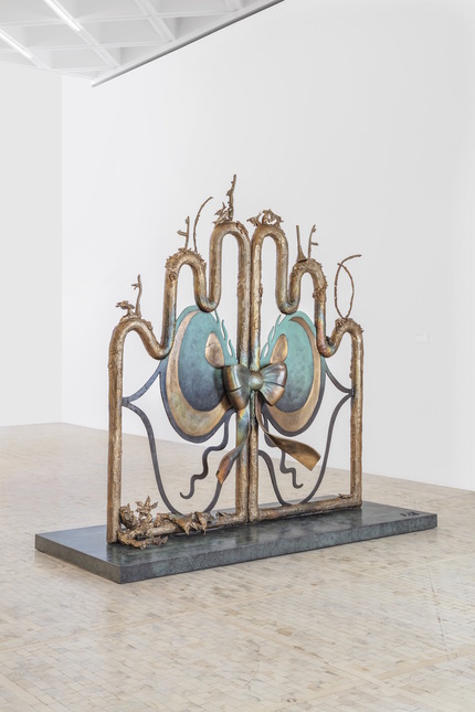 Ida Ekblad makes curious bedfellows of the most random things. For this exhibition, she scoured the streets of Mexico City for debris—such as a beat-up, yellow metal chair; a piece of wall framing; a porcelain bowl—and mashed them together in slabs of wet concrete, letting the assemblage dry poetically ad hoc. [more]